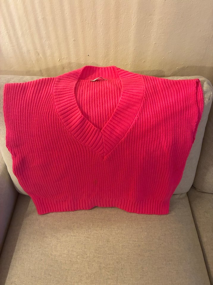Pembe renkli, V yakalı, örme triko kadın süveter, rahat ve bol kesimdir. Günlük kullanıma uygun, kollu olmayan ve normal midi boyda renkli bir seçenektir.