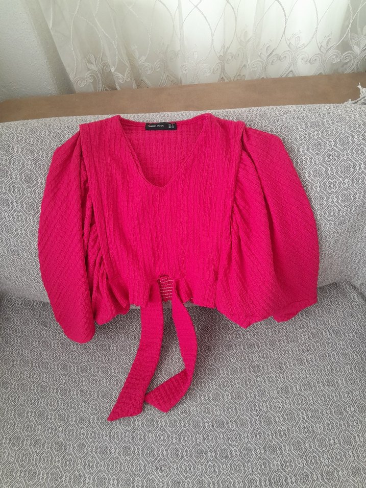 Pembe keten bluz, V yaka, bol kesim ve askılı kollu, fırfır detaylıdır. Kısa mini uzunlukta, bohem ve rahat tarzda günlük kullanıma uygundur. AZ LEKESİ VAR BİR KAÇ DEFA GİYİLDİ BİRAZ KISA