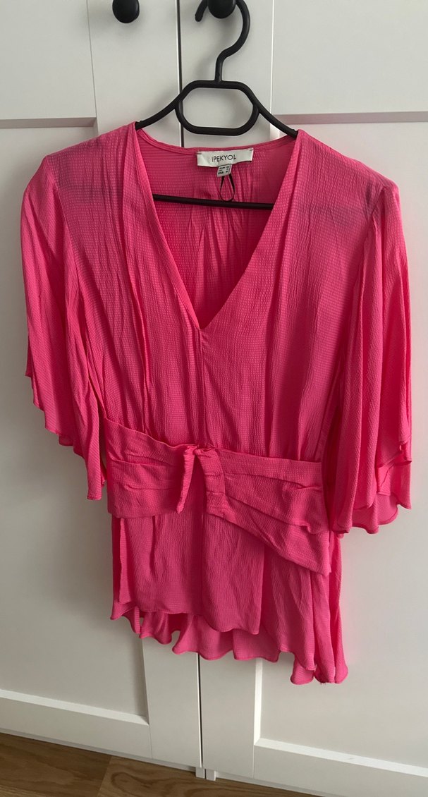 Pembe keten kumaştan, V yakalı, salaş kesim ve drapeli tasarıma sahip bluz. Askılı kollu ve midi uzunlukta, romantik akşamlar için ideal.