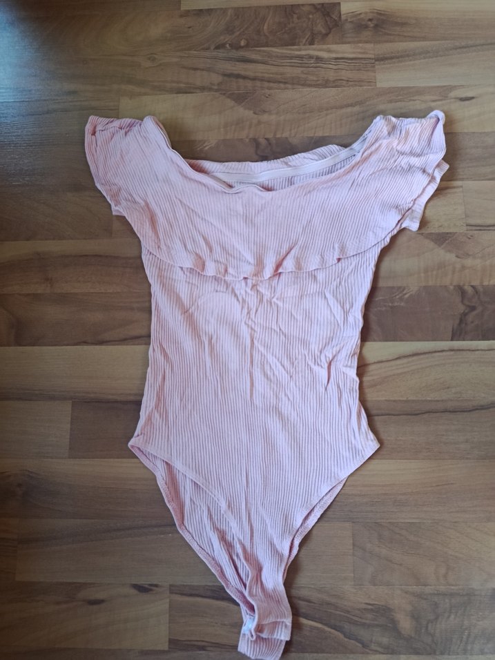Pastel pembe, V yaka ve kısa kollu bebek body, yumuşak kumaştan üretilmiştir.