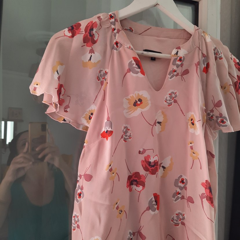 V yaka ve kısa volan kollu, bol kesim bluz. Pastel pembe çiçek desenli, yumuşak sentetik kumaştan, midi boyda ve günlük kullanıma uygun. içi penye.