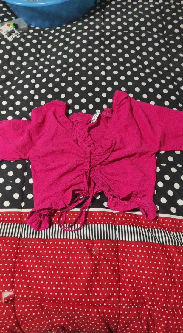 Pembe, uzun kollu, V yakalı ve önünde fırfır detaylı kısa kesim oturan bluz. Yumuşak sentetik kumaştan, rahat ve bohem tarzda bir parça.