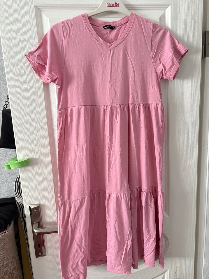 Pembe uzun elbise, V yaka ve kısa kollu tasarıma sahiptir. Yumuşak keten kumaştan üretilmiş olup, minimal ruffle detayları ile günlük kullanıma uygundur.