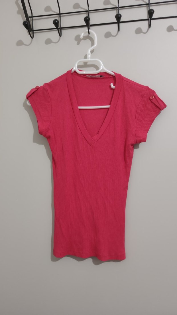 Pembe, V yaka ve kısa kollu, ince kesimli kadın tişörtü. Canlı renk ve minimalist tasarımıyla günlük sokak stiline uygundur.