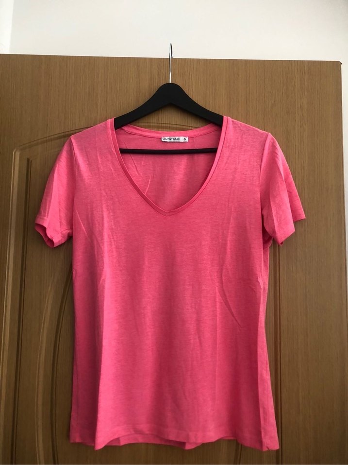 Pembe V Yaka Kısa Kollu Kadın Tişört