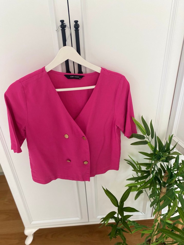 Pembe keten kumaştan, V yaka ve düğmeli önü olan, kısa kollu ve kısa boyda, salaş kesim gömlek.