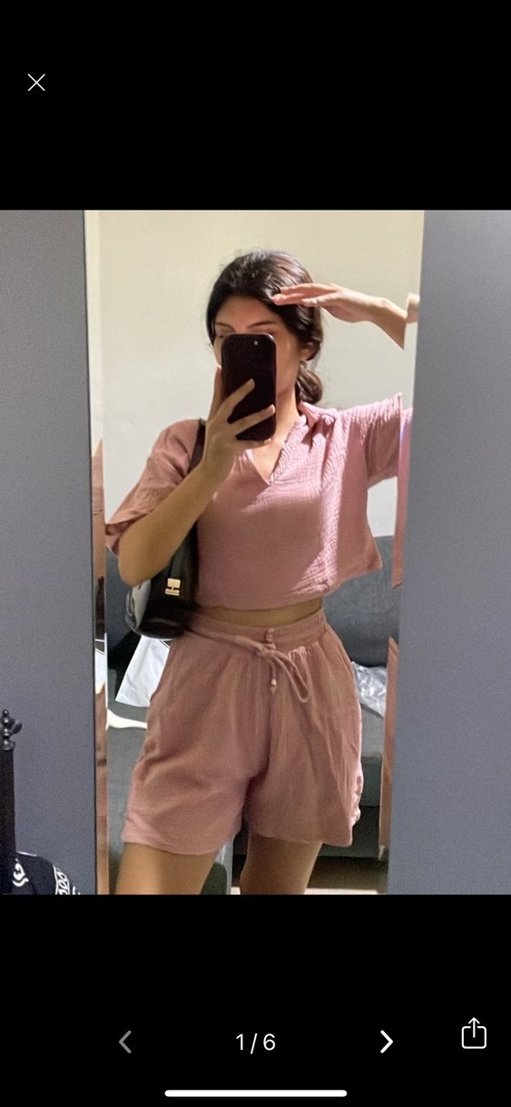 Pembe pastel renkte, V yakalı ve kısa kollu, bol kesin şortlu takım