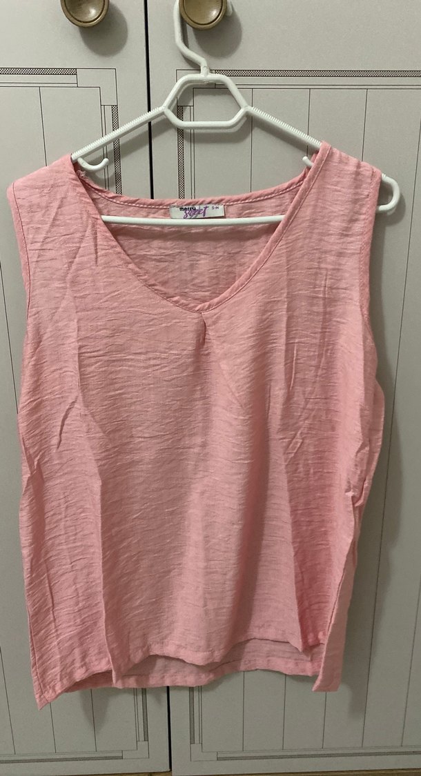 Kolsuz, V yakalı pembe keten kadın atlet. Rahat kesimi ve midi boyu ile sade, günlük kullanım için uygundur.