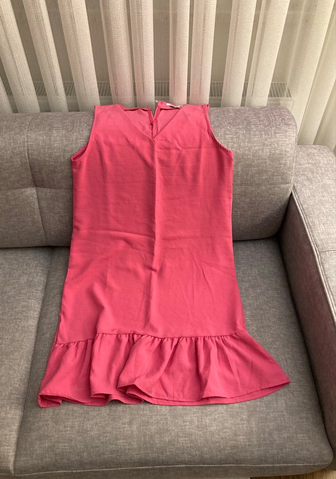 Pembe kolsuz midi elbise, V yaka ve etek ucunda fırfır detayına sahiptir. Yumuşak sentetik kumaştan üretilmiş olup, rahat bir günlük kullanım için bol kesimdir.