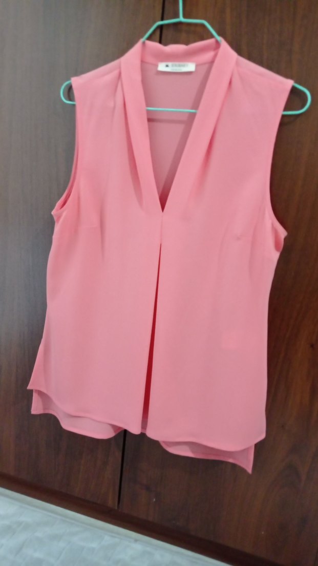 Yumuşak sentetik kumaştan, V yaka, kolsuz, drapeli ve salaş kesim pembe bluz. Ofis kullanımı için uygundur.