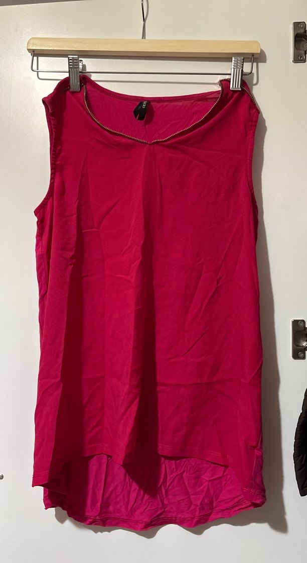 Pembe, parlak ve saten dokulu, kolsuz, V yaka, salaş kesim bluz.