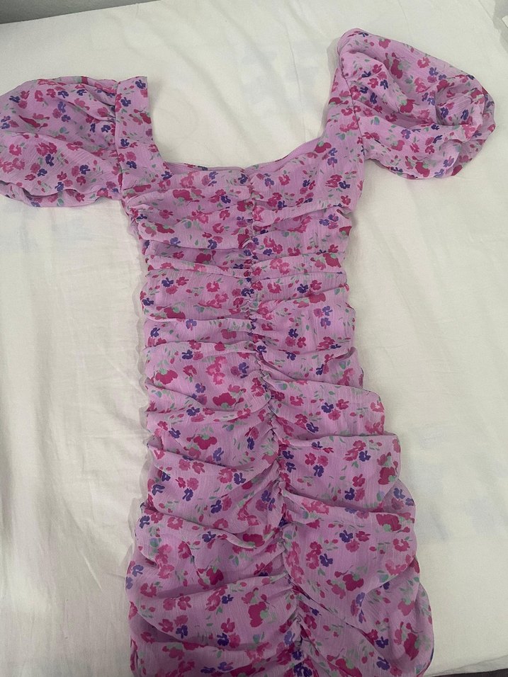 mezuniyet elbisesi için çok iyi bir tercih olur. V yakalı, büzgülü ve fırfırlı, sentetik yumuşak kumaştan yapılmış, pastel tonlarda bağlama desenli, midi boy bohem elbise. Askılı kollara sahiptir.