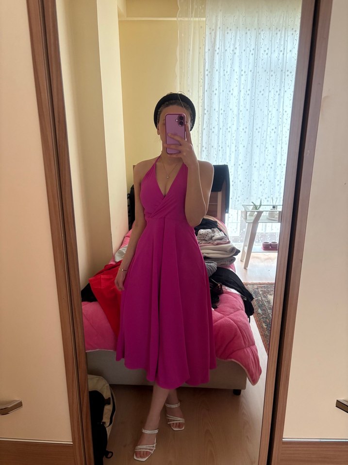 Parlak pembe sentetik kumaştan, V yakalı ve askılı, drapeli, normal boy midi elbise. Romantik buluşmalar için uygun.