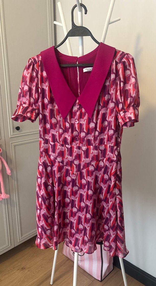 Pembe kısa elbise, düğmeli ve kısa kollu, V yakalı, bol kesim (boy 86-36 en metre ile ölçüm )