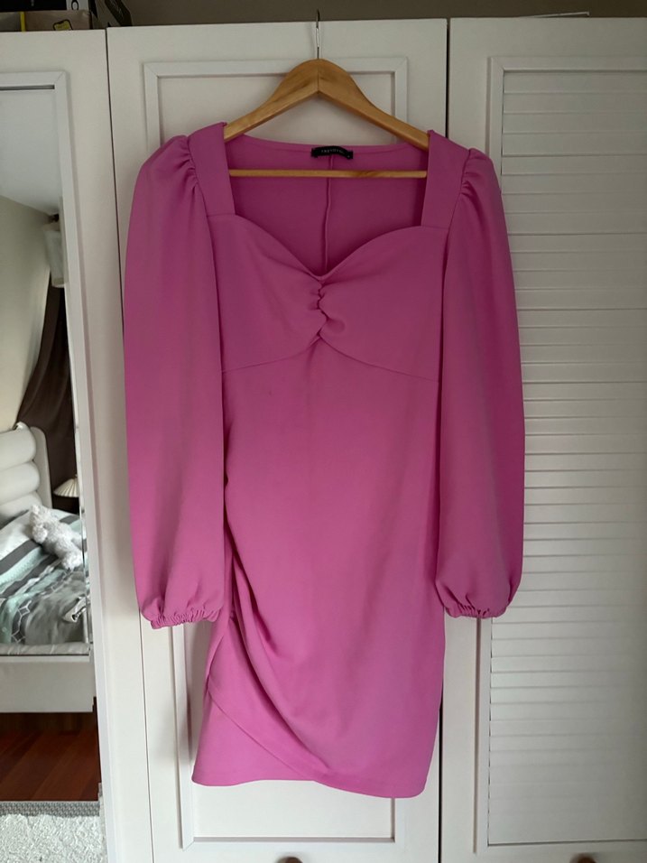 Pembe renkli, v yaka drapeli ve uzun kollu bu midi elbise, romantik akşamlar için şık ve modern bir tercihtir.