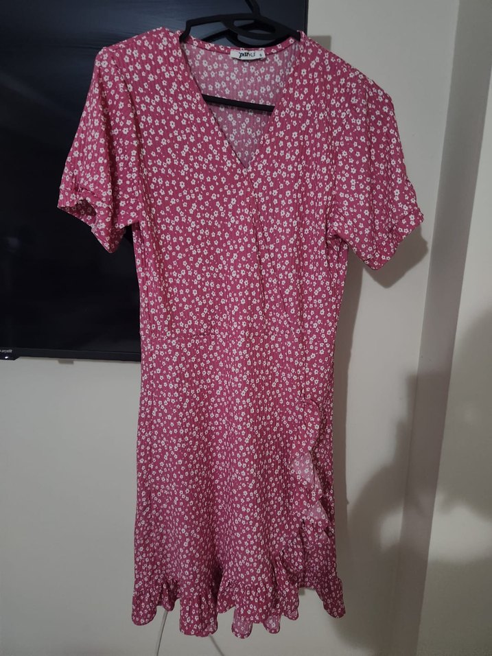midi elbise, kısa kollu ve V yakalıdır. Koyu pembe tie-dye desenli, sentetik kumaştan yapılmış ve fırfırlı etek ucu vardır.