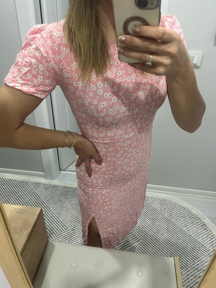 Pembe pastel tonlarında, çiçek desenli, kısa kollu ve V yakalı dantel detaylı, vücuda oturan midi elbise. Romantik akşamlar için uygundur. Yumuşak sentetik kumaştan yapılmıştır.