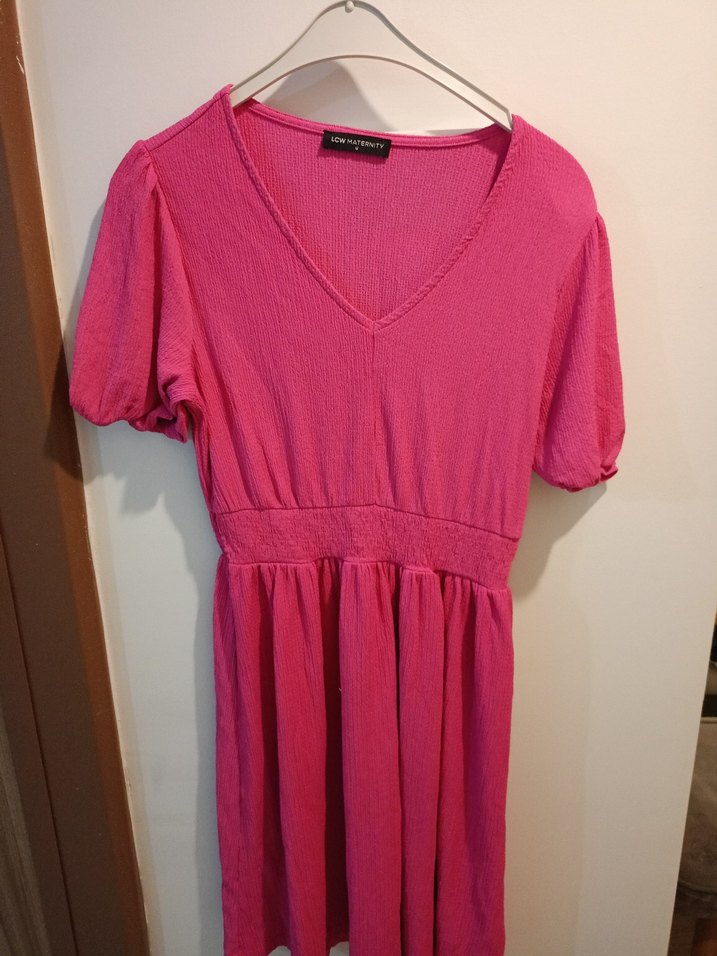 Pembe renkli midi boy keten elbise, V yaka ve kısa kollu. Bol kesimi ve pileli detaylarıyla rahat bir kullanım sunar.