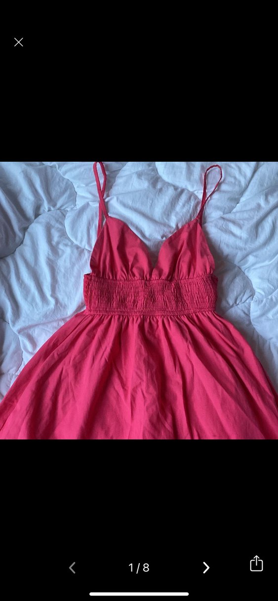 V yaka, askılı pembe midi elbise, pamuk kumaştan ve bel kısmı büzgülü. Romantik buluşmalar ve günlük sokak stili için uygundur.