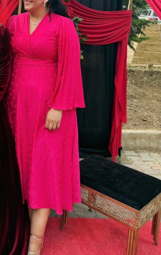 Kırmızı, V yakalı midi uzun elbise, bol kesim ve drapeli askılı kollara sahiptir. İpeksi kumaştan yapılmış, parlak ve desensizdir, romantik akş amlar için uygundur.