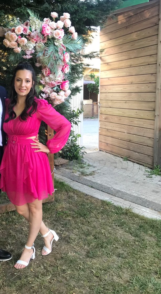 V yaka, askılı kısa mini pembe elbise parlak sentetik kumaştan, fırfır detaylı ve baskılı desene sahip, sokak modasına uygun.