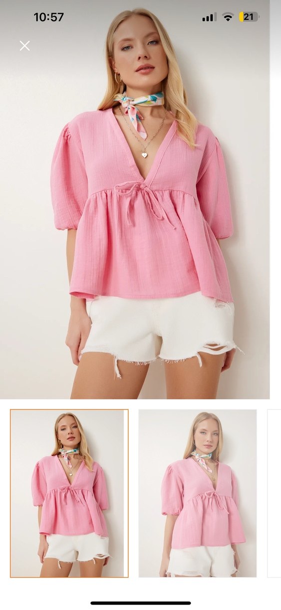 Pembe pamuk bluz, kısa kollu, V yakalı ve bol kesimdir. Günlük kullanım için rahat ve trend bir sokak stili sunar.