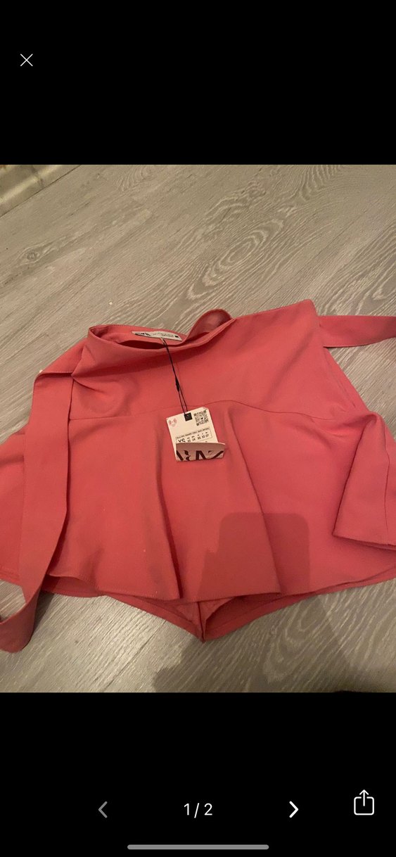 Pembe, uzun kollu, V yakalı, düğmeli ve baskılı desene sahip bol kesim mini gömlek. Sentetik kumaştan üretilmiş, günlük rahat stil için uygundur.