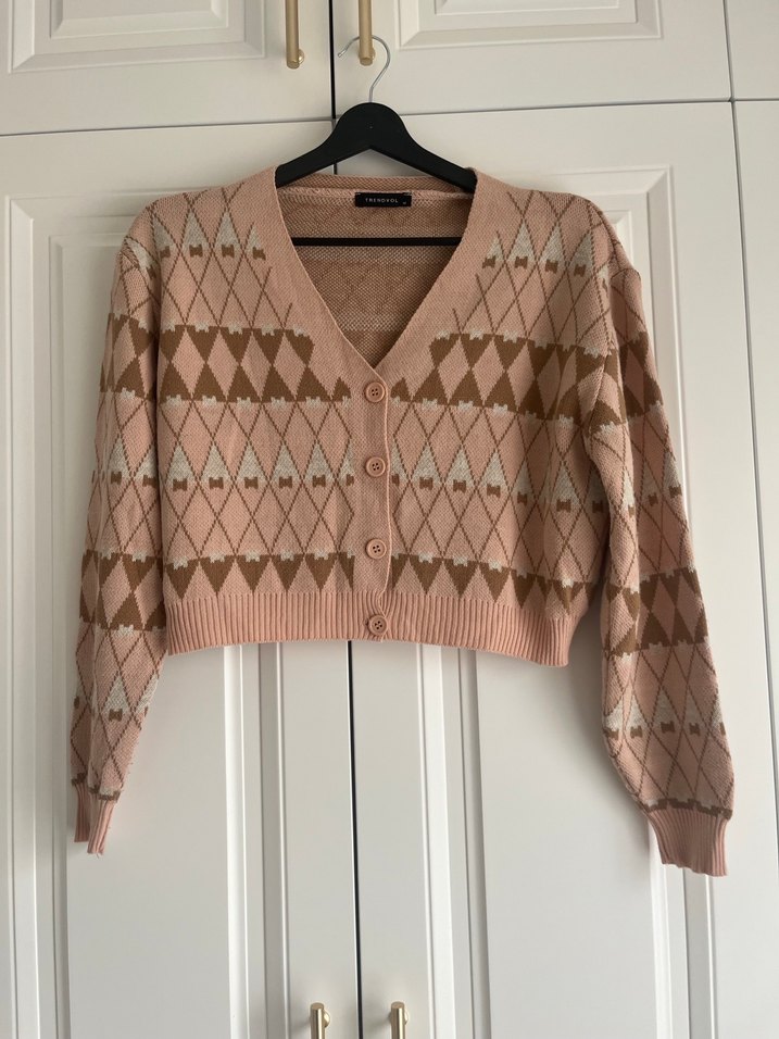 Bej renk, V yakalı ve uzun kollu kadın hırka. Örgü kumaş, retro baklava desenli ve normal boyda, rahat ve günlük kullanıma uygun.Birkaç kez kullanılmıştır temizdir