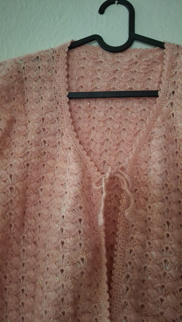 Pembe renkli, V yakalı ve örgü hamile hırkasıdır. Bol kesim ve yumuşak örgü kumaştan günlük kullanım için uygundur.