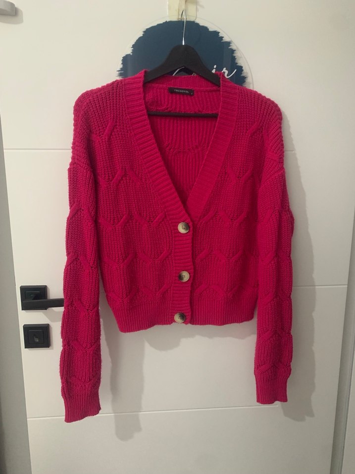 Pembe renkli, uzun kollu, V yaka ve örgü dokulu, midi boyda, rahat kesim kadın hırka. Günlük kullanıma uygun, şık ve sıcak tutar.