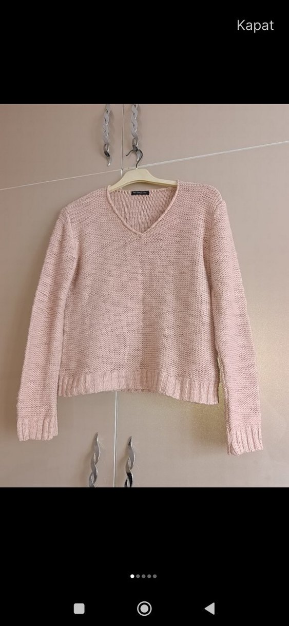 Pembe renkli, V yaka ve uzun kollu örgü kadın kazak, rahat bir görünüm için bol kesimdir. Düz ve pastel tonu ile günlük kullanıma uygundur.