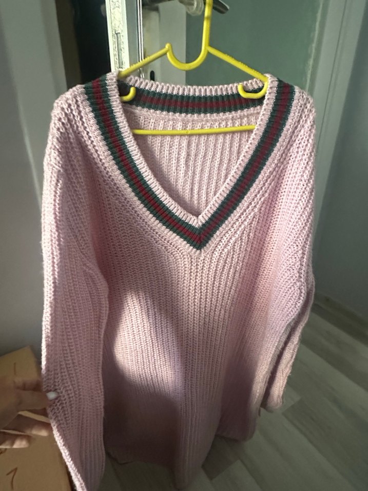 Pembe, V yaka ve uzun kollu, rahat kesim örgü kadın kazak. Pastel tonlarda, rahat ve günlük kullanıma uygun.