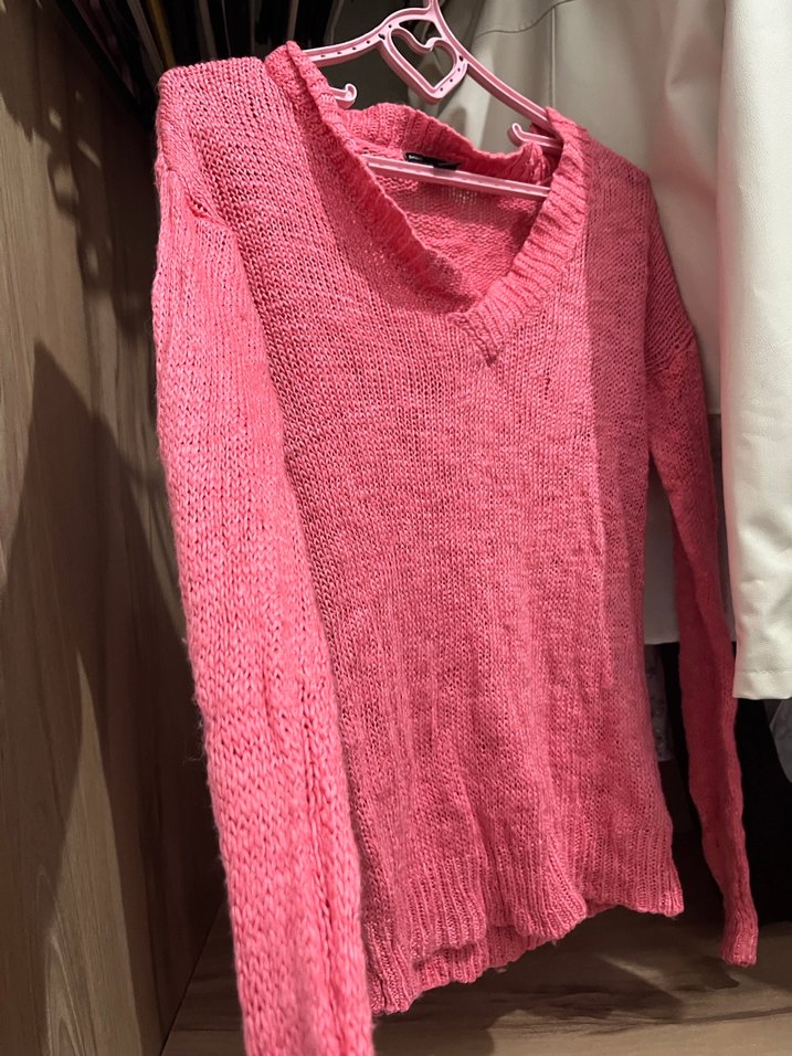 Pembe, V yakalı, uzun kollu, örgü ve normal boyda, rahat ve renkli kadın kazak. Günlük sokak stili için uygun, şık ve rahat bir seçim.