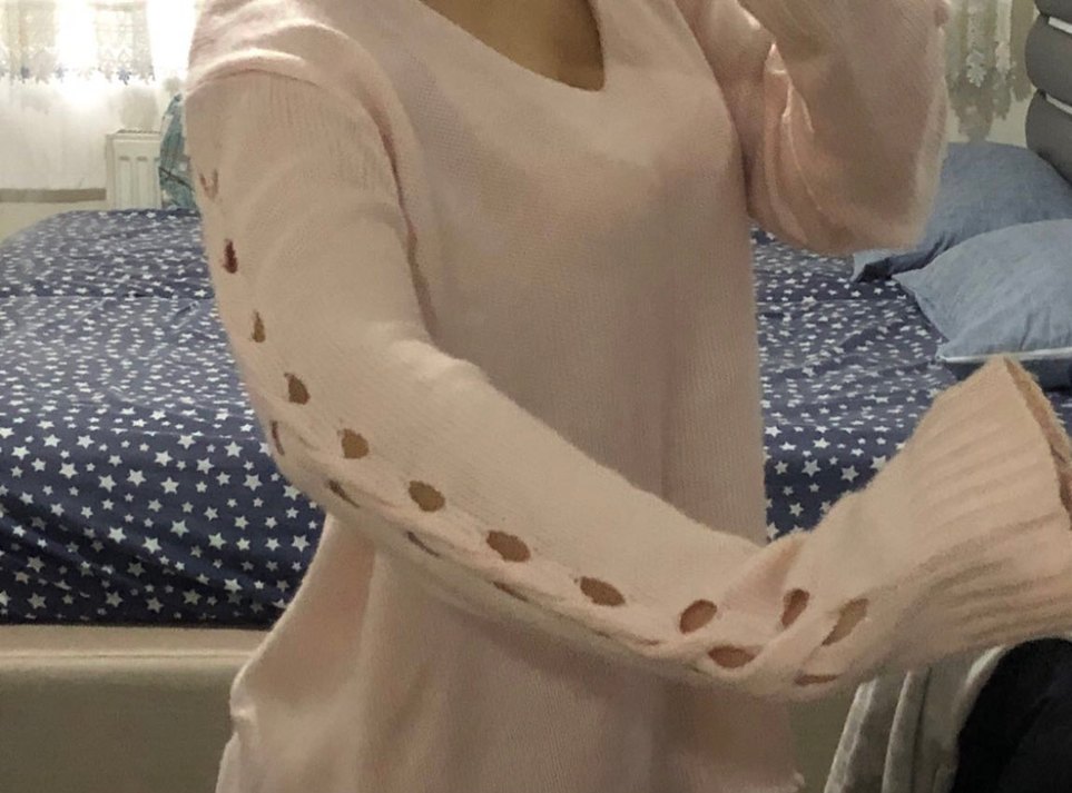 Pembe, V yaka, örgü kumaştan kadın kazak. Uzun kollu, kollarda kesikli detaylarla rahat ve salaş kesim, günlük sokak stili için uygundur. Alttan 2 cm kısaltıldı