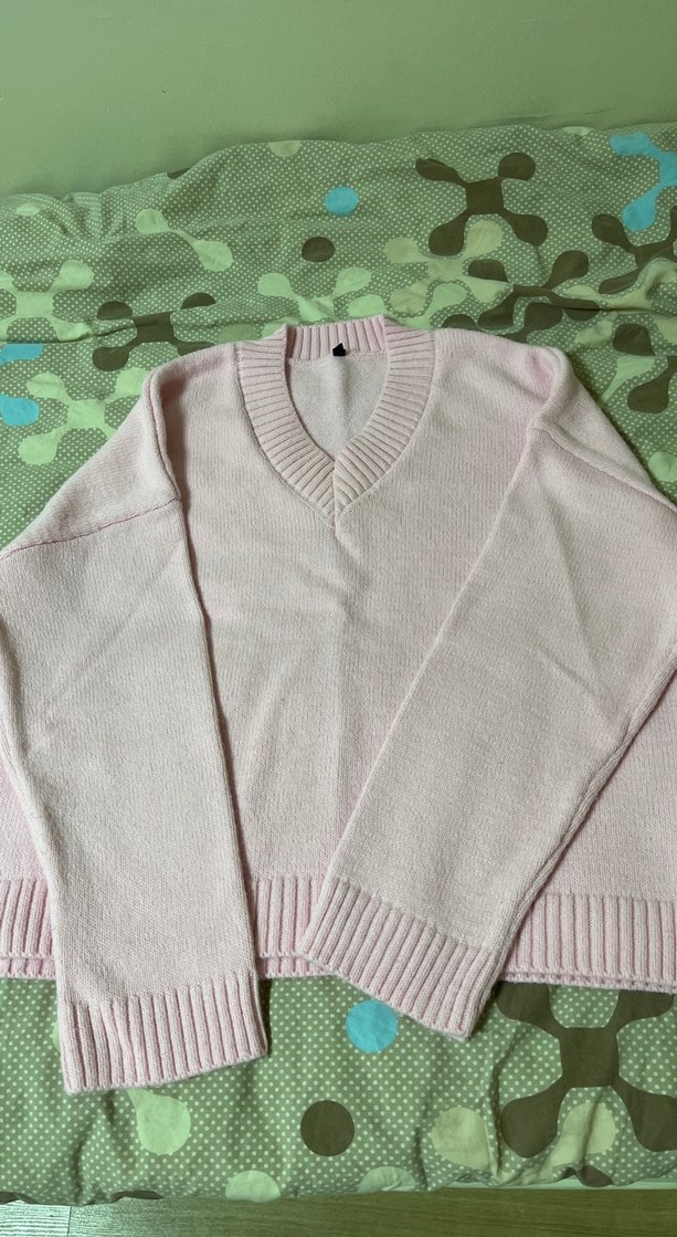 Rahat kesim, pastel pembe renkte, V yakalı ve uzun kollu örgü kadın kazak. Günlük kullanıma uygun, konforlu ve sade tarz.