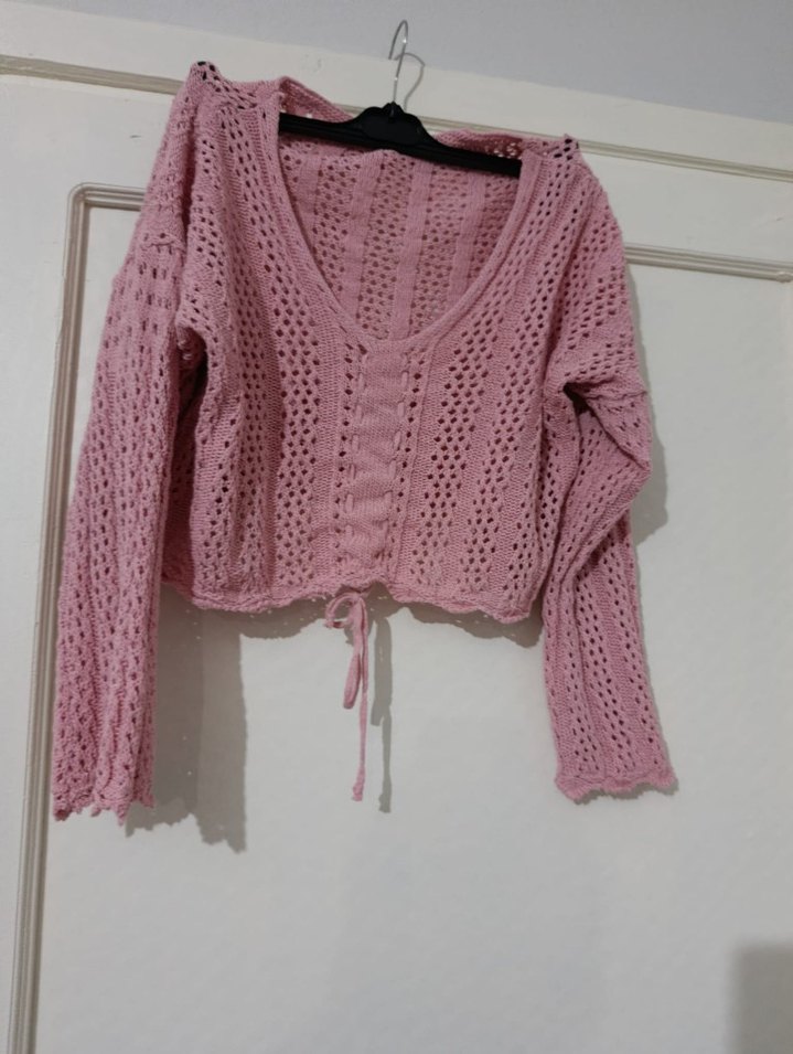 Pembe, uzun kollu, V yakalı, kısa uzunlukta, bol kesim örgü kadın kazak. Günlük kullanıma uygun, rahat ve bohem tarzda.