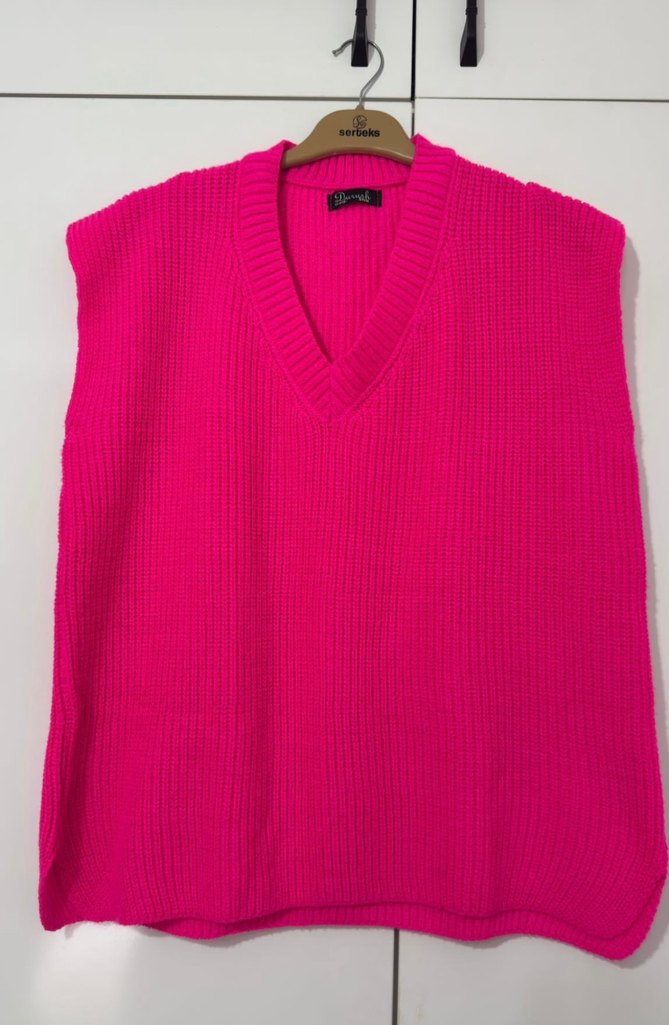 Hiç kullanılmadı tertemiz kargo bedava❗️ Pembe renkli, V yakalı, kolsuz örgü kadın süveter. Rahat kesimiyle günlük ve sokak stiline uygun, sıcak tutan bir parça.