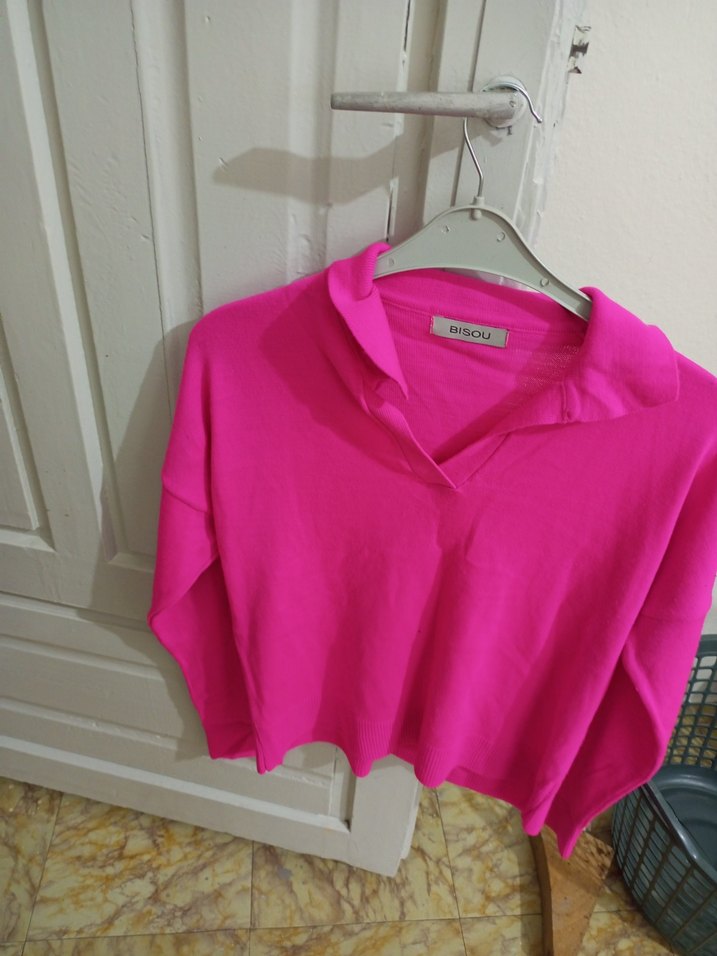 Pembe pamuklu kazak, V yaka ve uzun kolludur. Bol kesimi ve örme dokusu günlük rahat kullanım için uygundur.