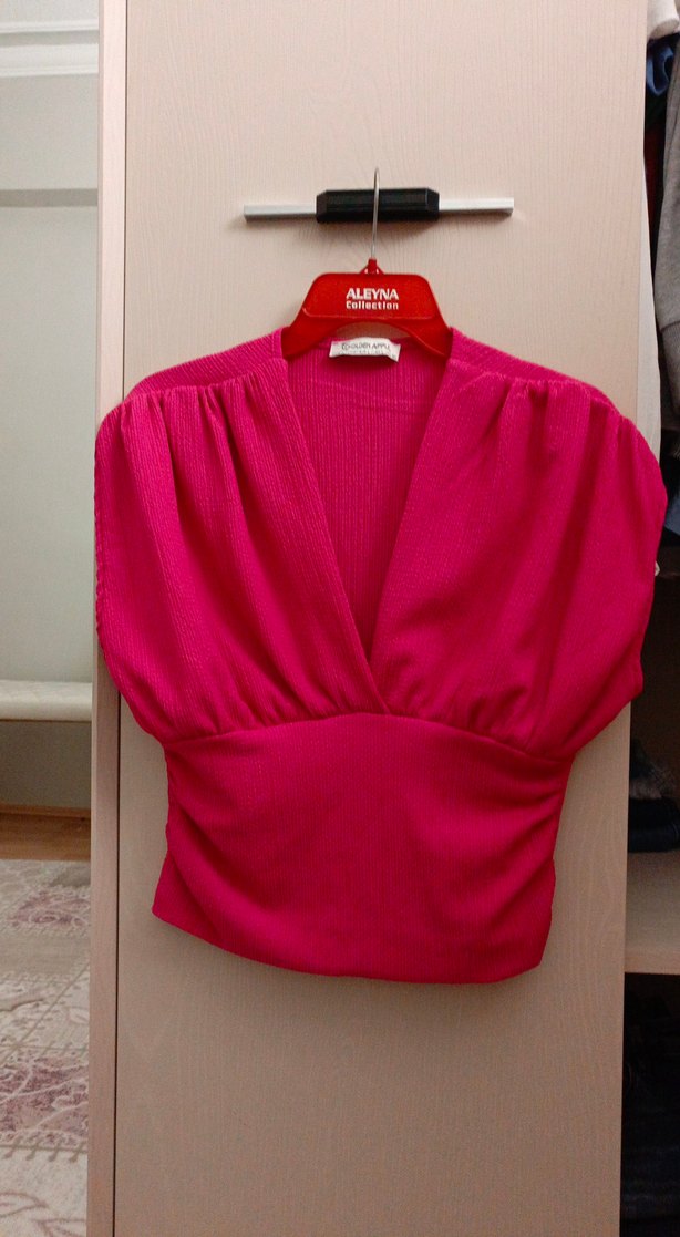 V yaka, pilili, kolsuz, pembe mini bluz. Sentetik kumaştan, günlük sokak stili için renkli ve iddialı bir parça. Hiç giyilmedi temiz