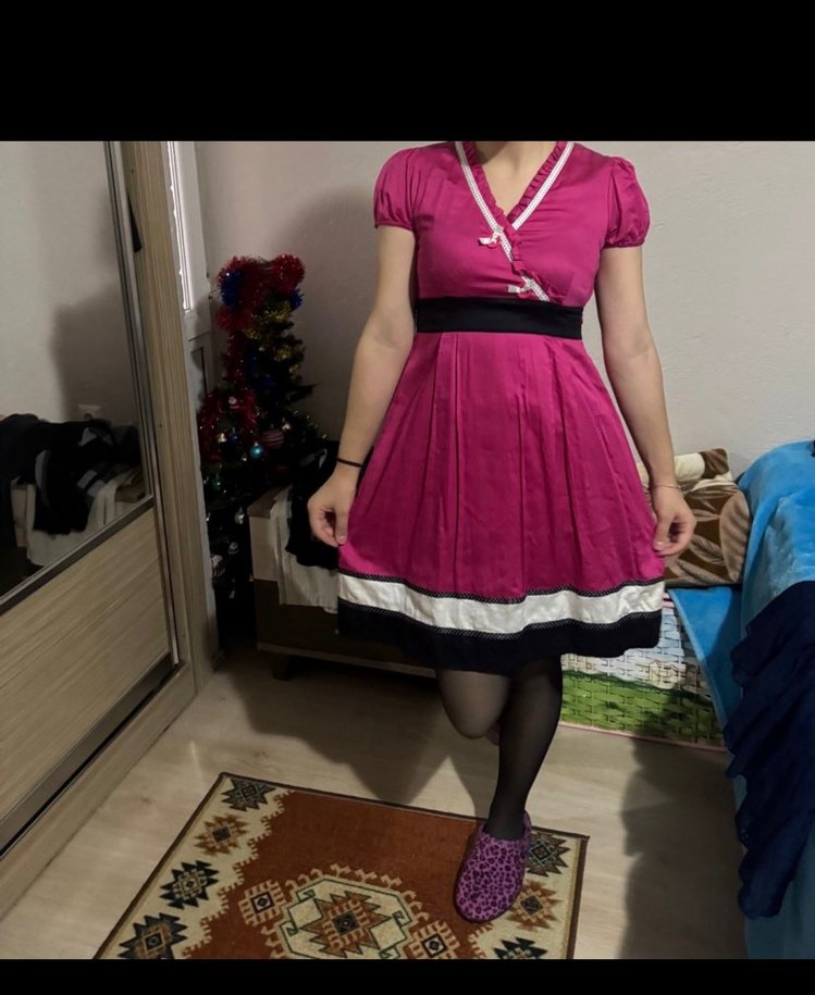 Pembe renkli, V yakalı ve pilili etekli, vücuda oturan midi elbisedir. İnce askılı kol stili ve koyu tonlarda tie-dye deseniyle günlük kullanıma uygundur.