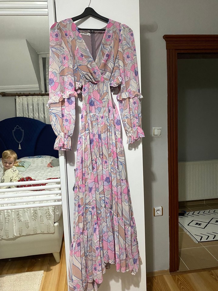 Pembe renkte, pastel tonlarda batik desenli, piliseli uzun elbise. V yaka, bol kesim ve yumuşak sentetik kumaştan, günlük kullanım için uygun.