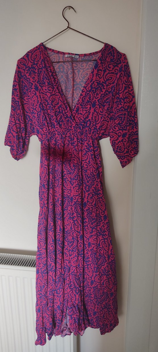 Pembe renkli, salaş kesim bohem uzun elbise. V yaka, kısa kollu ve ipeksi kumaştan, renkli batik desenli. Günlük kullanıma uygun drapeli tarzda.