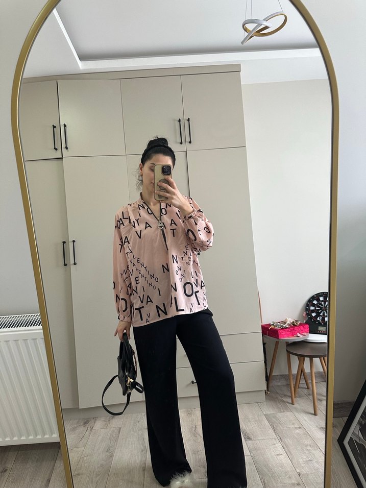 Pembe renkli, uzun kollu, V yaka ve salaş kesime sahip, hafif batik desenli, sentetik kumaştan günlük sokak stili gömlek.