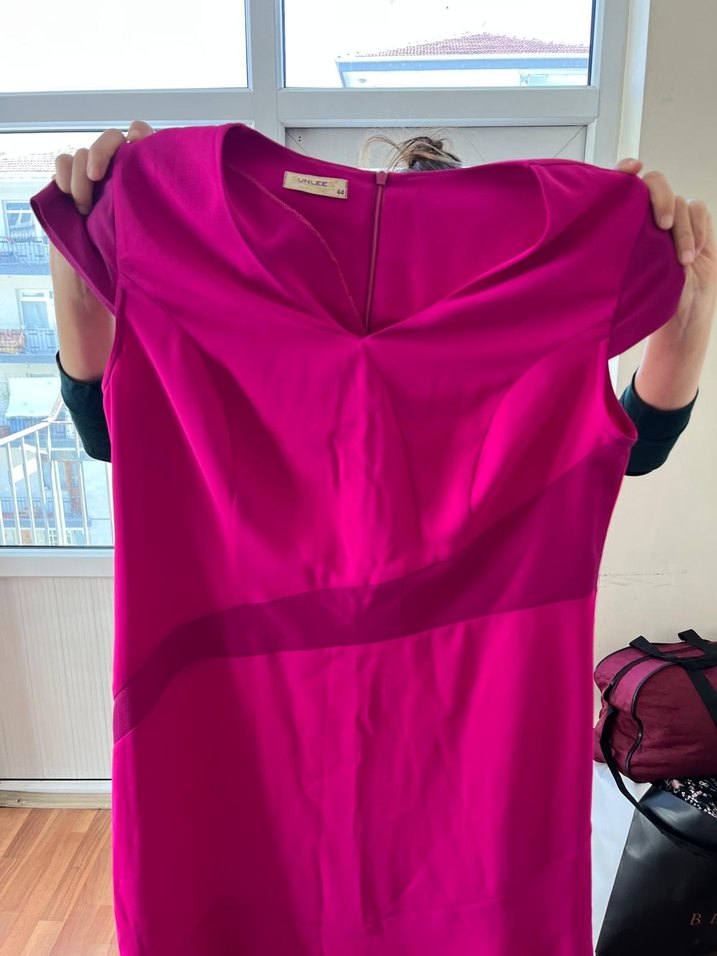 V yaka ve kısa kollu, saten görünümlü kumaştan yapılmış, drapeli, pembe parlak renkte, normal boyda ✨