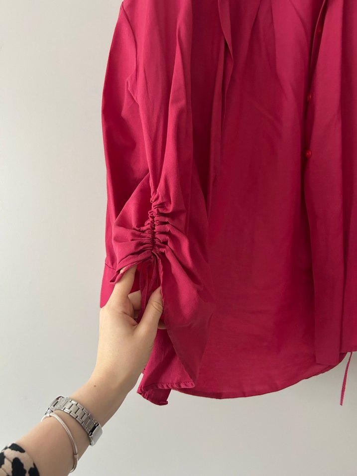 Pembe saten kumaştan, parlak ve bol kesim kadın gömlek. Uzun kollu, büzgülü detaylı, düğmeli V yakalı, günlük kullanıma uygun.