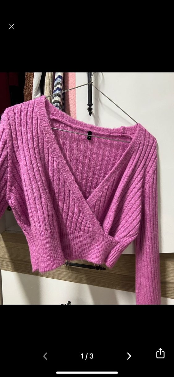 Pembe V yaka, uzun kollu, triko dokuma, normal midi boyda, rahat ve şık bir günlük kadın kazağı.