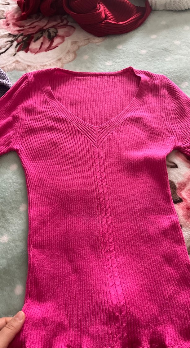 Pembe renkli, fit kesim, V yaka ve uzun kollu triko kazak. Yumuşak ve rahat kumaştan, günlük kullanım için uygun.