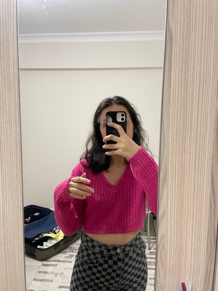 Pembe V Yaka Triko Kadın Kazak