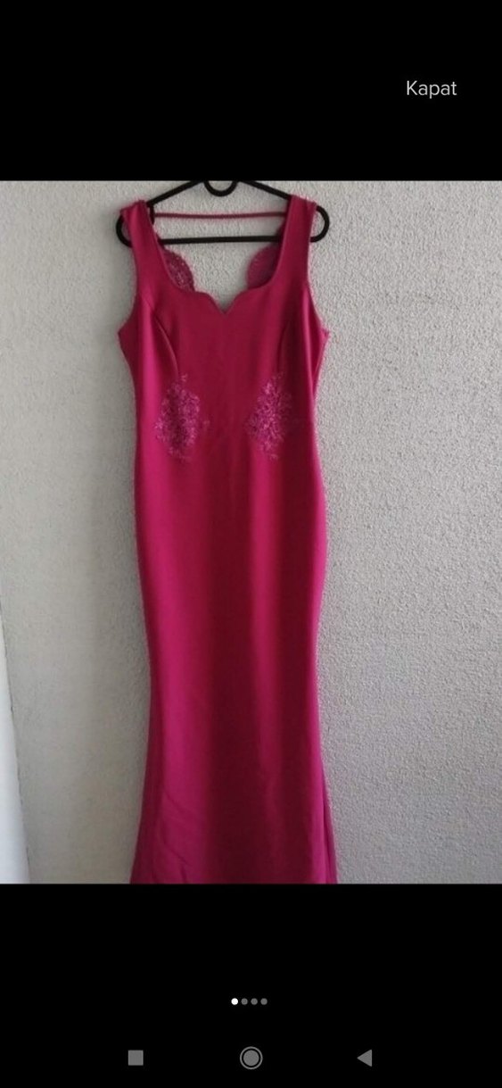 Pembe parlak kumaştan, V yakalı, kolsuz ve drapeli, klasik şıklıkta uzun abiye elbise.