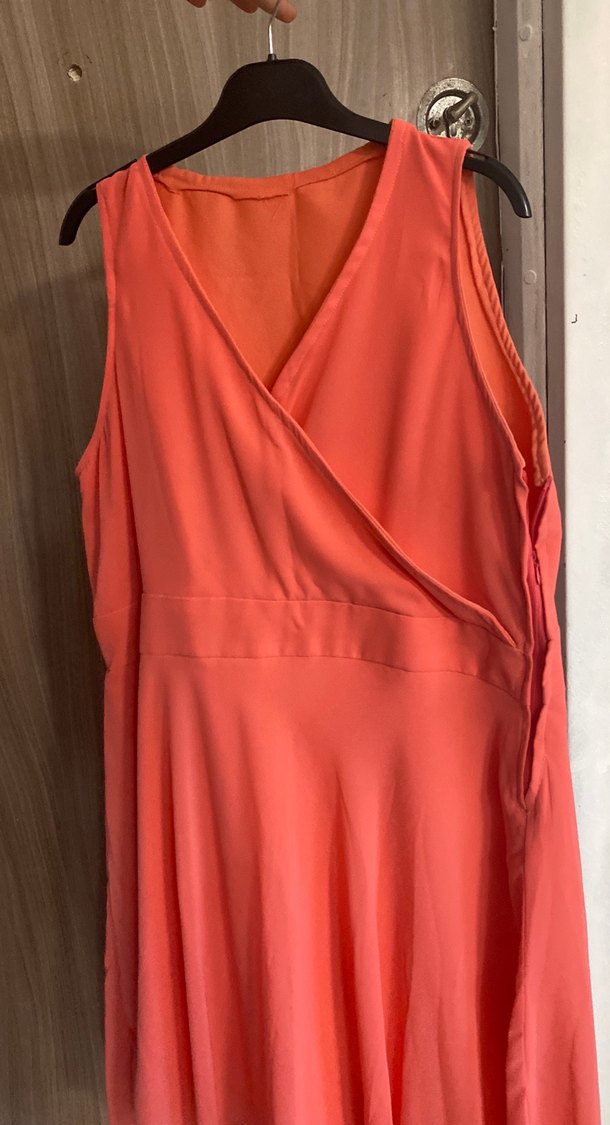 Pembe parlak kumaştan, v yaka ve drapeli, kolsuz, bol kesim uzun abiye elbisesi, günlük kullanım için uygundur.